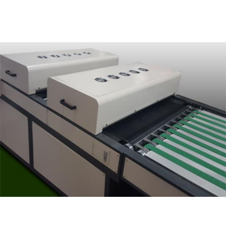 The drying system uses IR short wave lamp and hot air circulation design. The IR system is divided into three groups, which are composed of 24 1KW shortwave tubes, arranged in a slanting and crossing way, so that the curing effect is more balanced and the drying is more thorough. (When the conveyor belt does not work, the IR system will automatically close and automatically raise the lampshade to prevent fire.)